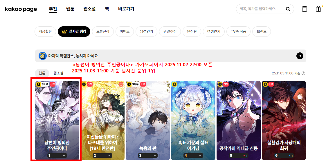 카카오페이지 실시간 랭킹에서 1위를 차지하며, 좋은 반응을 얻고 있습니다. (2025.11.03 11:00 기준)